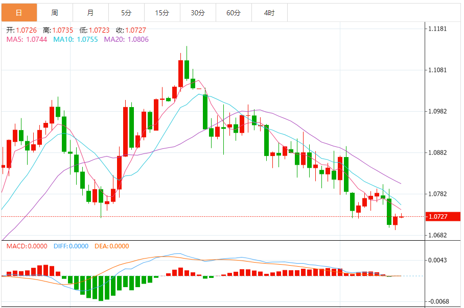 周四,欧元/美元徘徊于1.0733关口下方,现交投于1.0732附近,涨幅0.06%。
