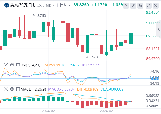 印度卢比今日走软。自2023年12月8日以来,美元兑印度卢比一直处于82.70-83.20的多月下降趋势通道中。