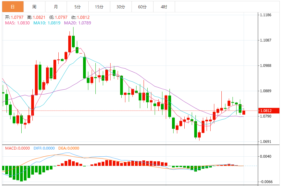 周五,欧元/美元徘徊于1.0812关口下方,现交投于1.0811附近,涨幅0.06%。