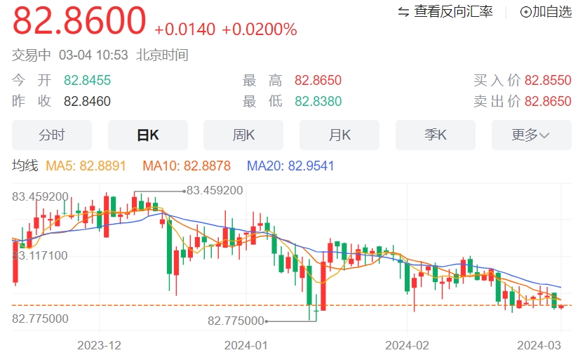 印度卢比当日持平。自 2023 年 12 月 8 日以来,美元/印度卢比一直在 82.70 至 83.20 之间的数月下降趋势通道内交易。