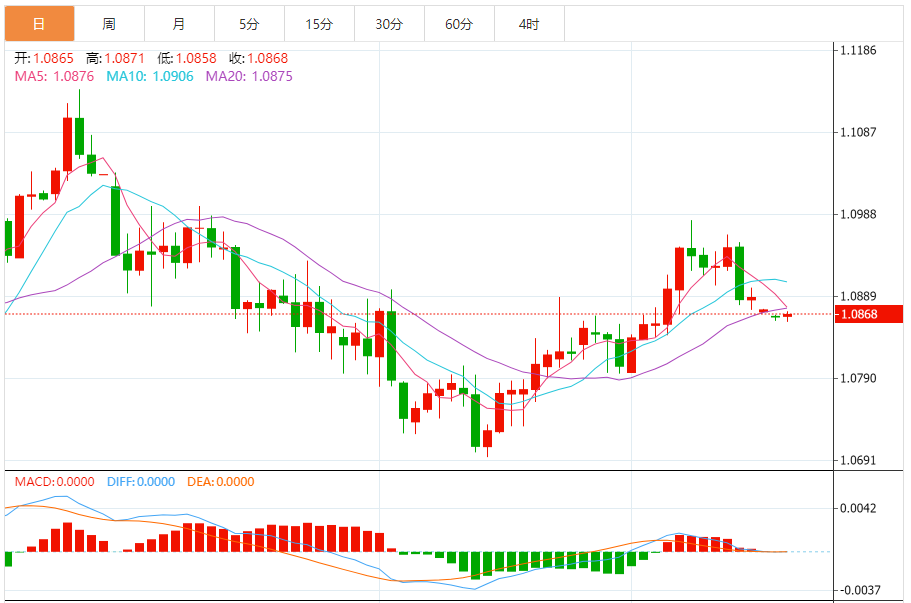 周三,欧元/美元徘徊于1.0869关口下方,现交投于1.0868附近,涨幅0.02%。