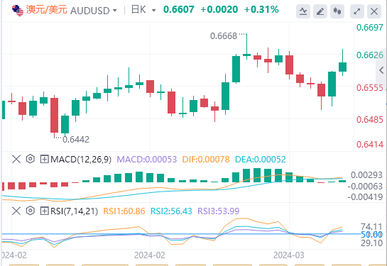 尽管如此,市场反应迅速,目前美联储在6月启动降息周期的可能性约为75%。加之近期股市继续走牛,使得避险货币美元持续低迷,接近一周低点。在官方报告显示2月份失业率从上月的4.1%降至3.7%之后,对风险敏感的澳元(AUD)获得了额外的提振。澳大利亚统计局(ABS)提供的进一步详细数据显示,2月份澳大利亚经济新增就业岗位11.65万个,甚至超过了最乐观的预期。这反过来又将澳大利亚储备银行(RBA)8月份降息的几率从数据公布前的80%降至60%。有利于澳元多头,表明澳元/美元货币对阻力最小的方向仍然是上行。