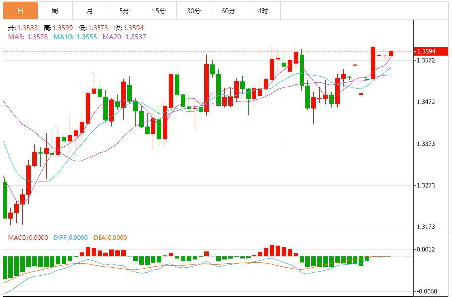 周三,美元/加元徘徊于1.3595下方,现交投于1.3594附近,涨幅0.08%。