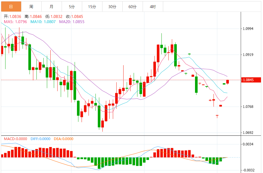周四,欧元/美元徘徊于1.0846关口下方,现交投于1.0845附近,涨幅0.09%。