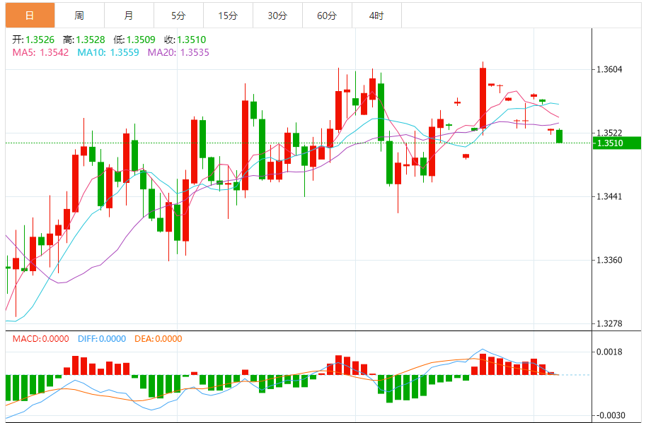 周四,美元/加元徘徊于1.3512下方,现交投于1.3510附近,跌幅0.12%。