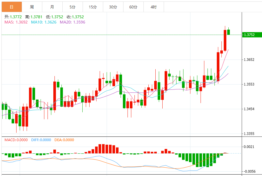 周一,美元/加元徘徊于1.3754下方,现交投于1.3752附近,跌幅0.13%。