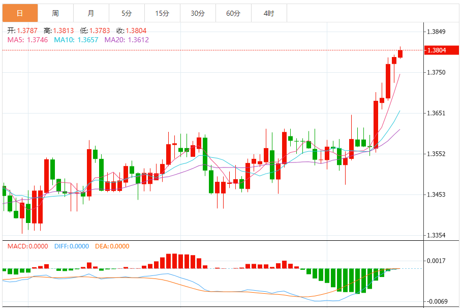 周二,美元/加元徘徊于1.3805下方,现交投于1.3804附近,涨幅0.12%。