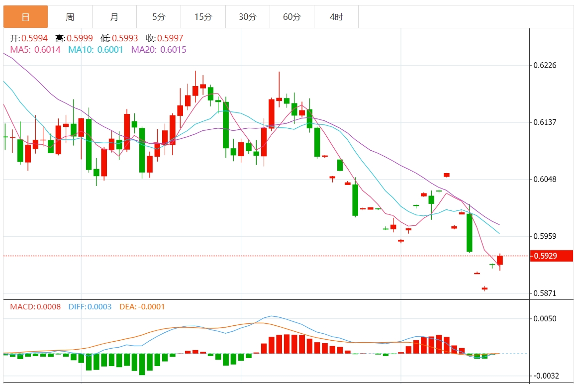 纽元/美元位于转换线上方,处于跌势中。纽元料测试云图的下边界0.5965,然后下跌至0.5795。 确认跌势的额外信号将是自看跌通道的上边界反弹。若突破云图的上边界且价格位于0.5995上方,该情形可能被取消。 与此同时,突破上升通道的下边界且价格跌破0.5895将确认跌势。