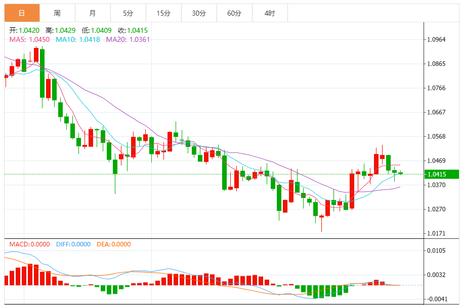 周四,欧元/美元徘徊于1.0415下方,现交投于1.0414附近,跌幅0.07%。