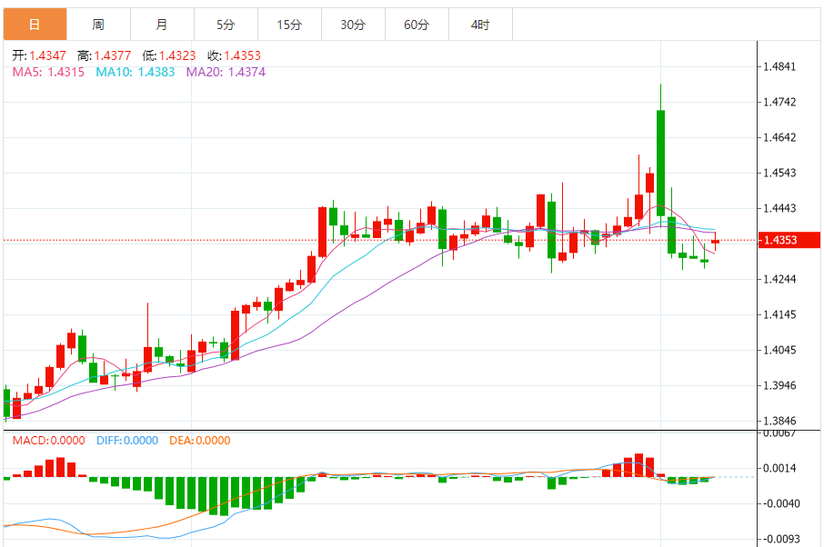 周一,美元/加元徘徊于1.4354下方,现交投于1.4352附近,涨幅0.40%。