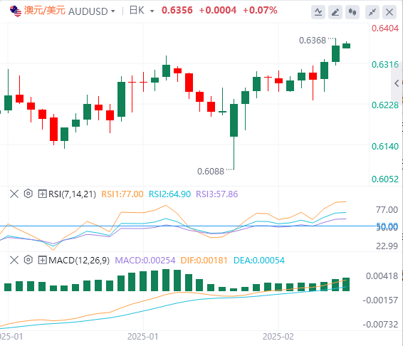从好的方面来看,澳元/美元可能会测试上升通道的上边界0.6380,然后是心理价位0.6400。