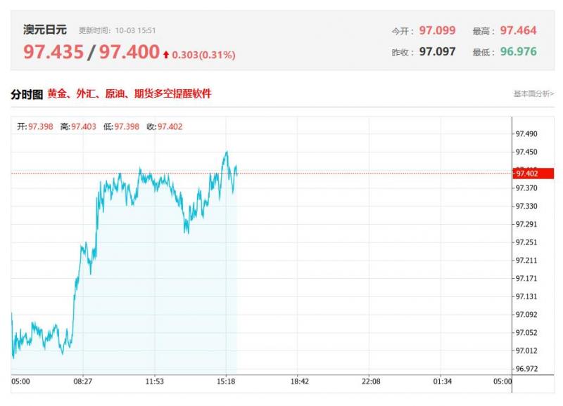 周五盘中,澳元/日元报97.40, 涨幅0.31%.