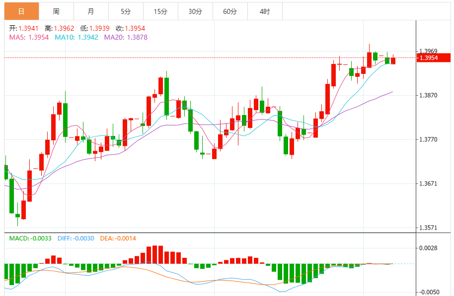 周二,美元/加元徘徊于1.3957下方,现交投于1.3955附近,涨幅0.10%。
