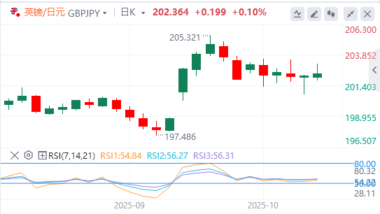 该货币对在通道顶部受顶,接近203.10,并在欧洲早盘回吐涨幅,接近盘中低点202.00。通道底部200.90区域似乎是一个可能的目标。