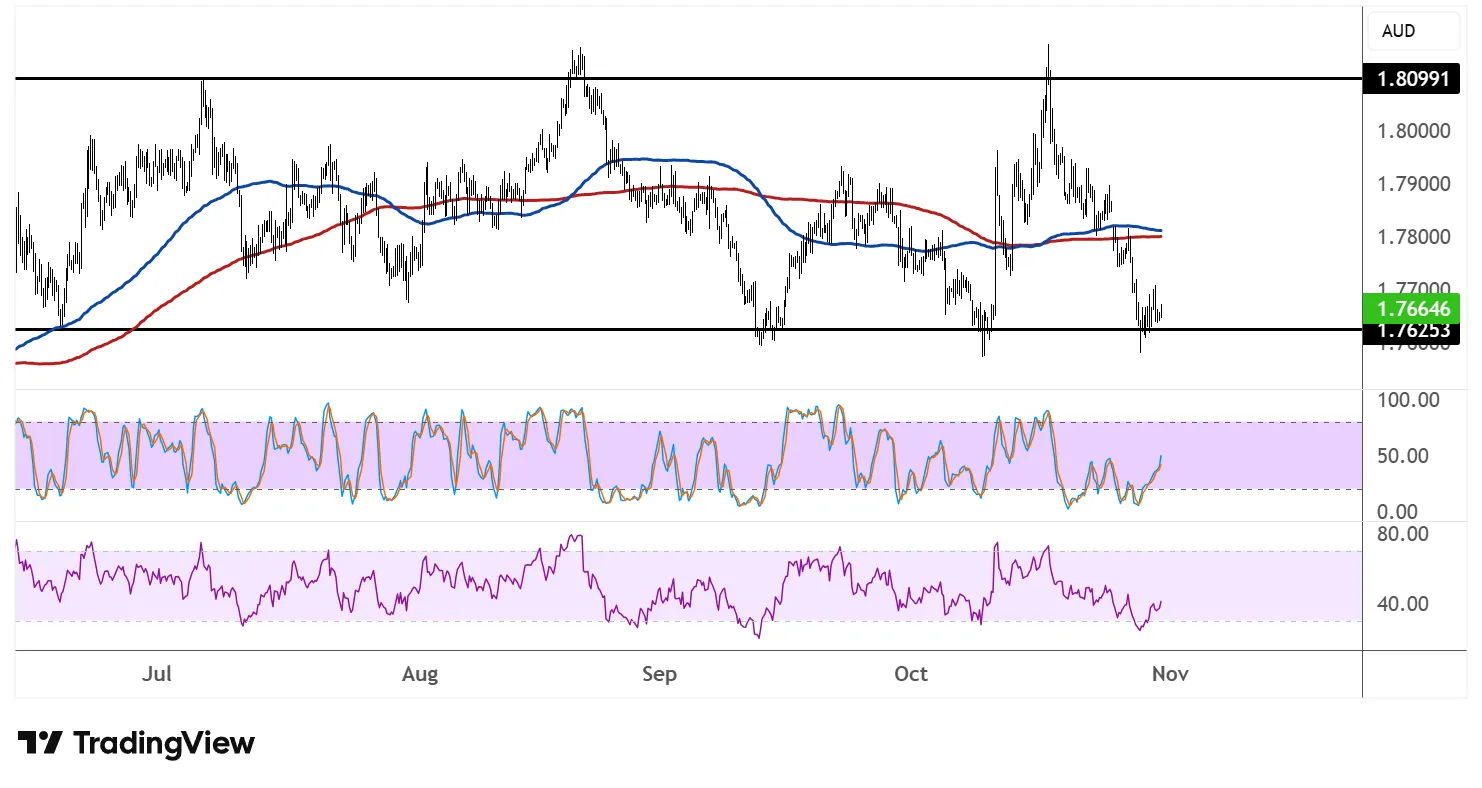 价格目前正在测试1.7665附近的区间底部,该区域可能决定该货币对是反弹至中档目标还是跌破以持续抛售。