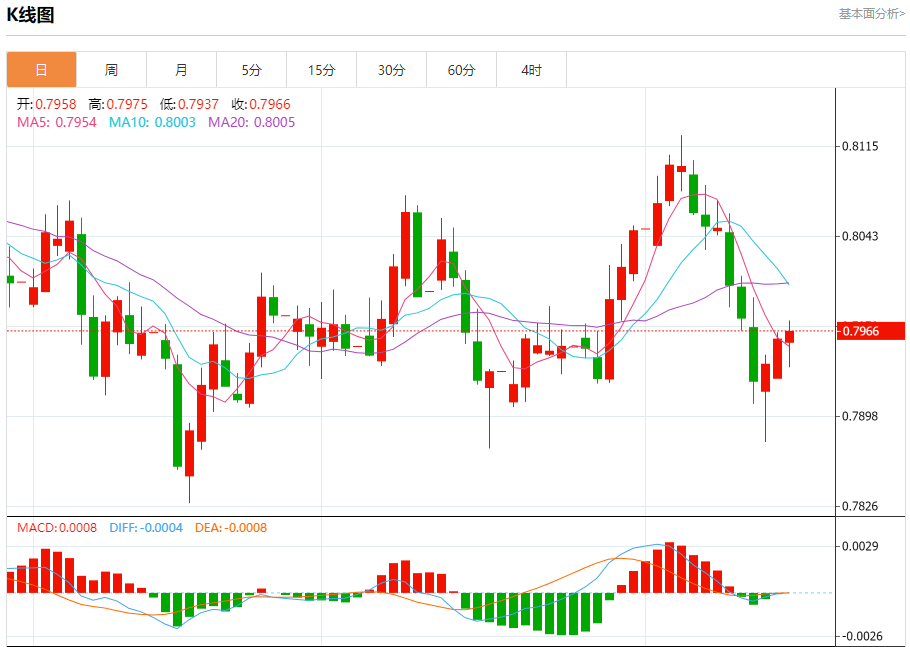 技术点评:RSI技术指标大于中性区域50。 MACD技术指标处在其信号线之上看多。 配置为正。 此外,价位高于其20天及50天移动平均线 ( 分别位于0.7956 和0.7949 )。 最后,价位突破其布林线通道上轨 (位于0.7963。