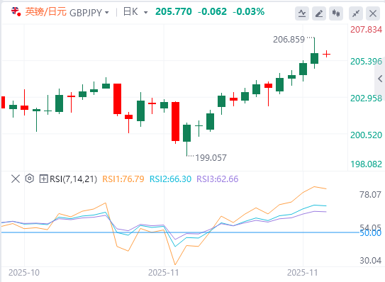 英镑/日元首个关键阻力位为206.00,随后是11月20日的高点206.86。若突破后者,将暴露207.00及2024年7月11日峰值208.11。