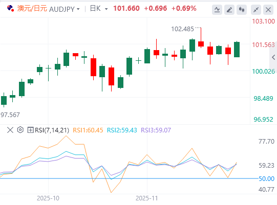 只要价格保持在上升的均线上方,趋势将保持有利,该均线目前位于98.00点下方,应提供动态支撑。若MACD突破至正区间,将增强向102.45-102.50区间推进的理由,该区间为上周触及的自2024年7月以来的最高水平。