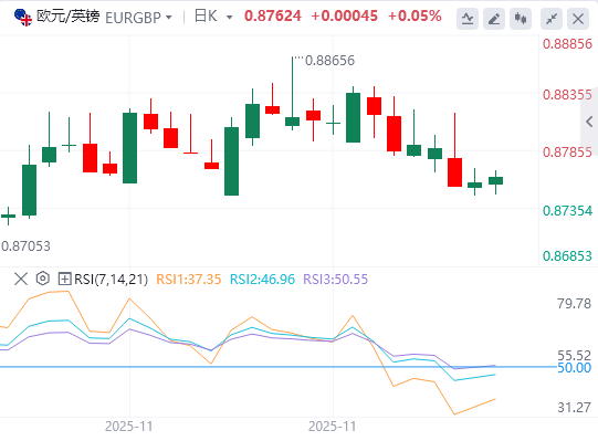 欧元在10月底至11月初反弹的61.8%斐波那契回撤位0.8742获得支撑,并试图突破之前的支撑区0.8770(11月3日、10日及25个低点)。再往上,0.8820附近有一组阻力,反向趋势线与11月24日和26日低点相接,11月14日高点0.8765之前。