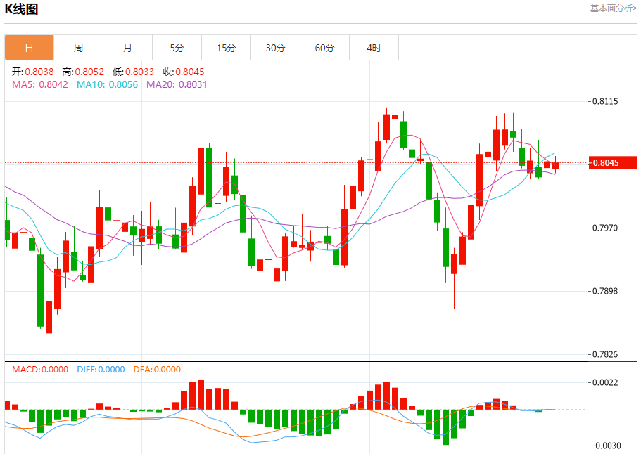技术点评:RSI技术指标大于中性区域50。 MACD技术指标处在其信号线之上看多。 配置为正。 此外,价位高于其20天及50天移动平均线 ( 分别位于0.8027 和0.8033 )。