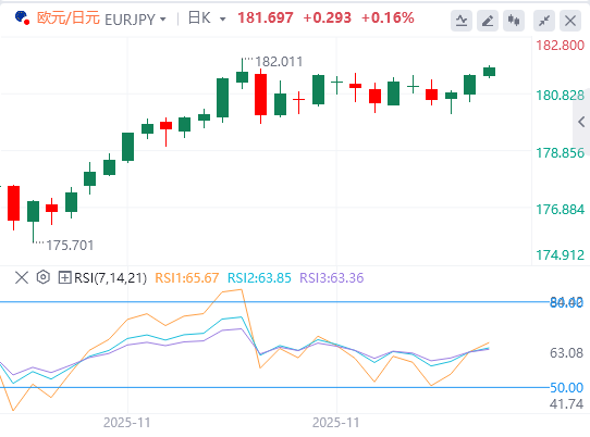 布林带压缩在近期交易日加剧,回调将受到下179.34的支撑,随后上涨的100天均线175.67。移动平均线梯度保持正值,保持了更广泛的上层偏向。RSI从62.91微升至63.51,确认动能改善。跌破179.34将预示更深的回撤至175.67;而维持布林中线则使欧元兑日元保持上游。