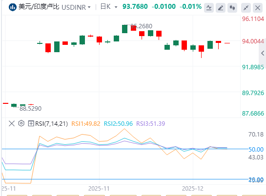 从技术面看,美元/印度卢比日线报90.0970,仍位于20日均线(89.6463)上方,维持多头趋势。均线系统呈上升态势,显示短期上行动能稳健。相对强弱指数(RSI)报62,虽较此前超买区域回落,但仍处于多头区间,表明涨势温和但持续。