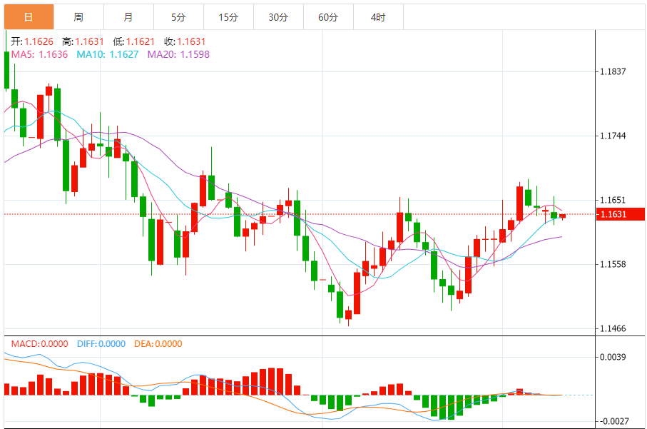 周三,欧元/美元徘徊于1.1631下方,现交投于1.1630附近,涨幅0.04%。