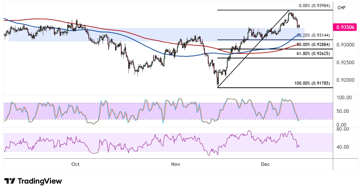 38.2%的斐尔波位于0.9314,紧邻0.93000心理水平的关注区域,可能成为多头的第一道防线。50%水平位于0.9288,而更深的回调可能达到61.8%的斐波罗来纳0.9262。