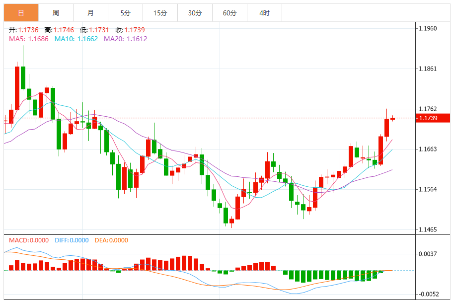 周五,欧元/美元徘徊于1.1741下方,现交投于1.1739附近,涨幅0.02%。