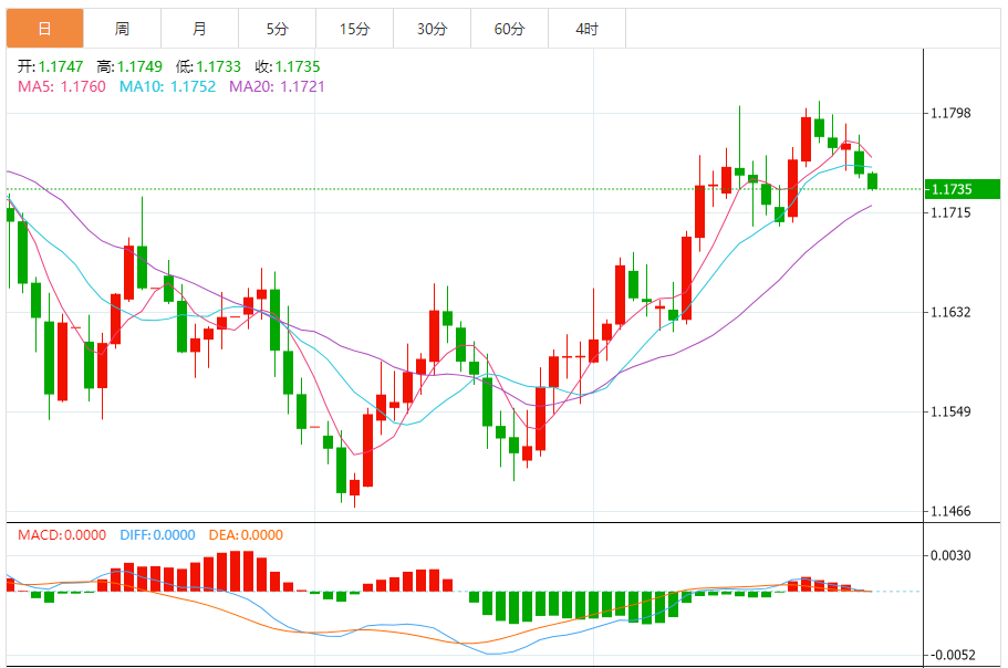 周三,欧元/美元徘徊于1.1736下方,现交投于1.1736附近,跌幅0.10%。