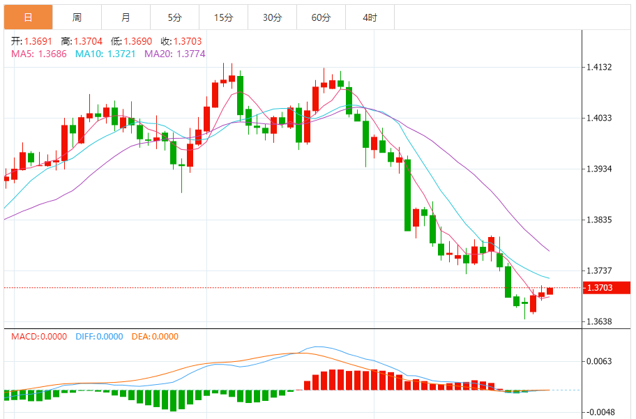 周三,美元/加元徘徊于1.3705下方,现交投于1.3703附近,涨幅0.06%。