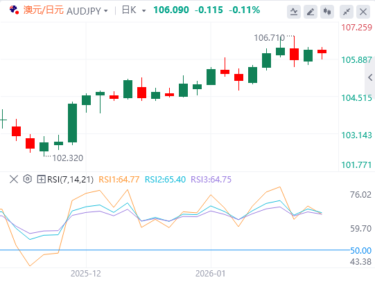 日线图中,澳元兑日元稳守100日均线101.52的上升趋势,保持整体多头趋势。平均线持续上涨,价格在该指标上方时有支撑。价格位于布林带上游106.52至中段105.21之间,反映出高点附近强烈的买盘兴趣。乐队在近期的演出中有所扩展,显示出势头的提升。RSI(14)为66,显示出强劲但未超买的动能。