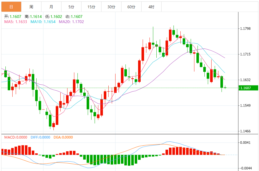 周五,欧元/美元徘徊于1.1609下方,现交投于1.1607附近,涨幅0.00%。