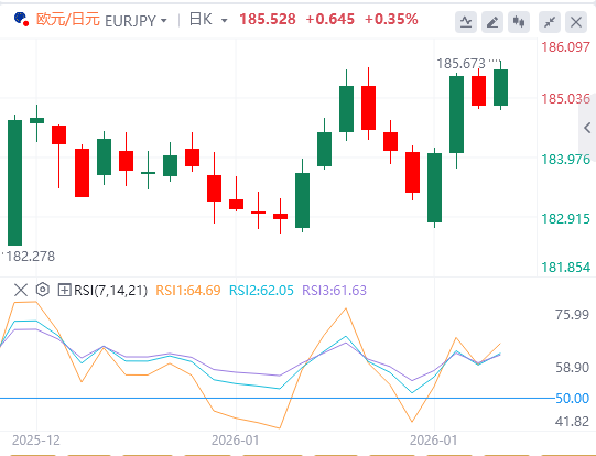 日线图中,欧元/日元稳稳守在100日均线上方,保持中期偏向高位。RSI(14)报61.93,显示出无超买条件的正向动能。
