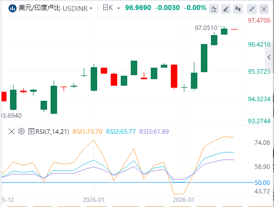 截至撰写本文,美元/印度卢比坚守在91.8115。20日指数移动平均线(EMA)走势上升至90.8253,支撑了此次上涨。价格保持在这一上升的20天均线上方,保持短期偏向向上。