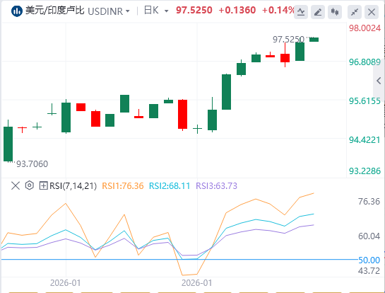 截至撰写本文时,美元兑印度卢比(USD/INR)交易在91.60附近。日线图分析显示该货币对存在持续的多头偏向,处于上升通道内。然而,14天相对强弱指数(RSI)位于71.10,显示出超买状况,表明动能被拉长,短期回调或盘整风险增加。