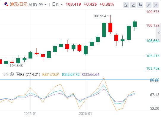 日线图中,澳元兑日元保持在100日均线上方,保持了整体上升趋势。价格略高于布林带上方,108.39,显示出阻力带被拉长,阻力带不断扩大。RSI在68.31接近超买门槛,确认了坚实的多头动能。日收盘若高于该区间,可能延长走势,若遭拒绝则会向中线地区线下撤。