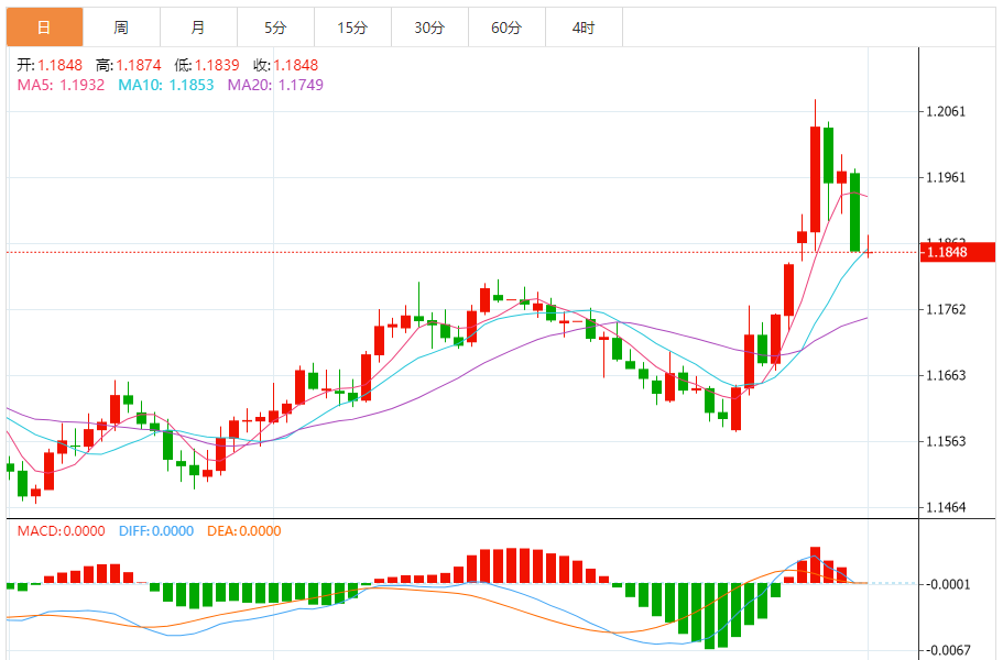 周一,欧元/美元徘徊于1.1846下方,现交投于1.1845附近,跌幅0.05%。