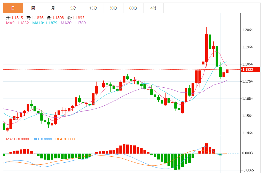 周三,欧元/美元徘徊于1.1834下方,现交投于1.1833附近,涨幅0.14%。