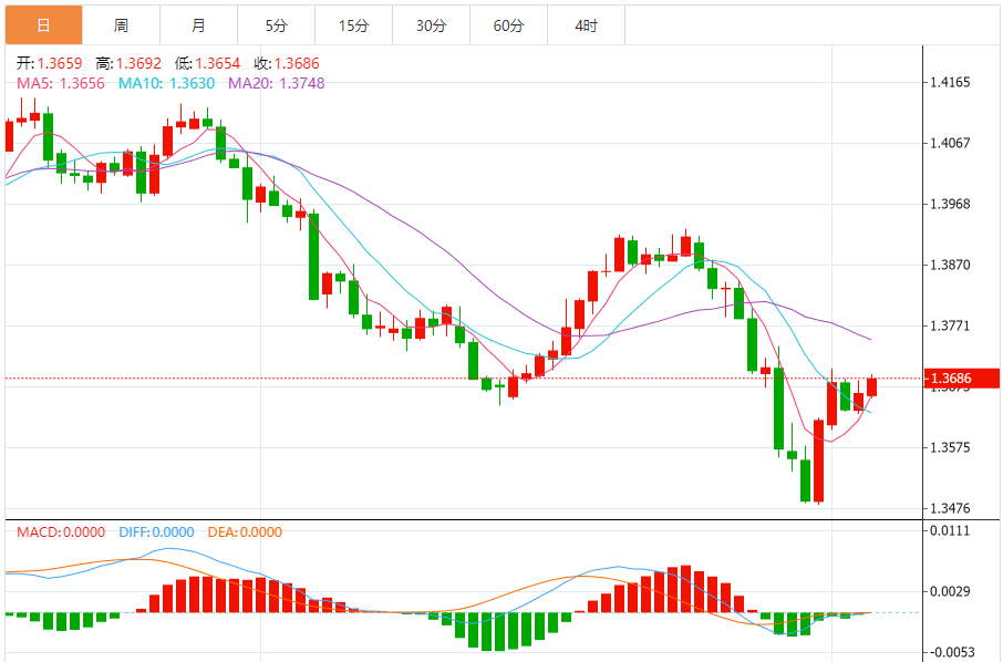 周四,美元/加元徘徊于1.3687下方,现交投于1.3685附近,涨幅0.17%。