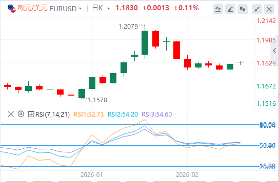 在美伊周五结束一轮谈判后,关于中东可能发生冲突的担忧有所缓解。这反过来又拉动了追踪避险美元兑一篮子货币的美元指数(DXY),从上周四触及的两周高点回落,成为欧元兑美元汇对的重要顺风因素。此外,美国联储(Fed)与欧洲央行(ECB)利率路径的分歧也支持该货币对短期内获得额外收益。
