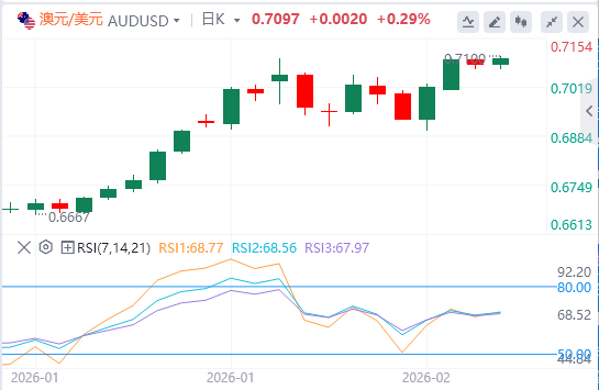 澳大利亚储备银行(RBA)近期加息25个基点至3.85%,与美联储(Fed)的鸽派利率路径形成鲜明政策背离,为澳元提供基本面支撑。周三将迎来关键数据冲击——原定于2月6日发布的美国1月非农就业数据因政府关门推迟至2月11日公布,市场共识预期新增就业7万(前值为5万),同时包含年度基准修正和失业率数据。若非农数据疲软,可能加剧美元走弱,推动澳元进一步上涨;反之,强劲数据或引发澳元回调。此外,周三还将有三位美联储官员(Schmid、Bowman、Hammack)发表讲话,可能加剧市场波动。