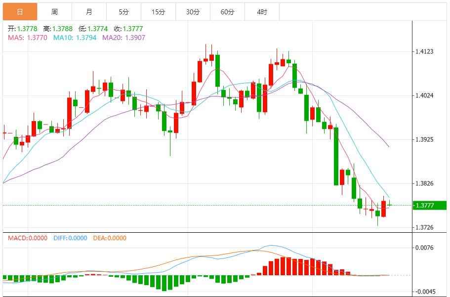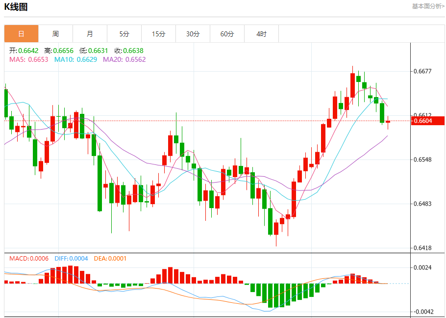 今日周四,澳元兑美元报0.6607,涨幅0.04%;美元兑加元报1.3793,涨幅0.05%;美元兑瑞郎报0.7958,涨幅0.06%。 澳元兑美元汇率分析 技术点评:只要依旧存在0.6615阻力位,期待回归至0.6580。 阻力位:0.66400.66250.6615 支撑位:0.65800.65650.6550 美元兑加元汇率分析 技术