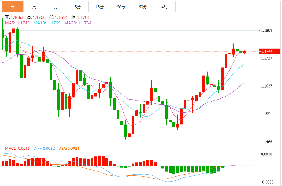 今日周四,欧元兑美元报1.1716,跌幅0.20%;英镑兑美元报1.3381,涨幅0.04%;美元兑日元报155.771,涨幅0.08%。 欧元兑美元汇率分析 技术点评:只要依旧存在1.1745阻力位,很可能下跌至1.1705。 阻力位:1.17751.17601.1745 支撑位:1.17051.16851.1670 英镑兑美元汇率分析