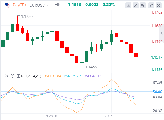 欧元/美元日线图显示,价格已跌破21日均线1.1574,14日RSI指标持续处于50下方,强化看跌预期。下方支撑位依次为11月5日低点1.1469、200日均线1.1395及心理关口1.1350。若反弹需首先收复21日均线,后续目标指向50日与100日均线交汇的1.1650区域,突破后或挑战1.1700阻力位。
