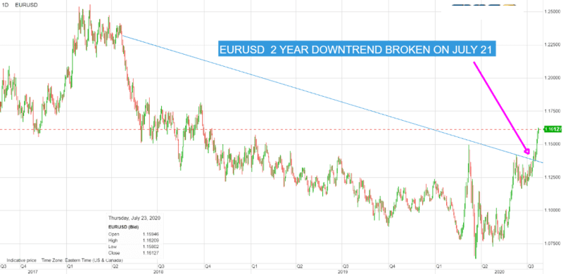 欧盟同意建立7500亿欧元的复兴基金(“下一代欧盟”),包括3900亿欧元的赠款和3600亿欧元的贷款。欧盟最终选择利用自身的信贷力量来支持欧元区的经济增长。欧元/美元从周一的1.1405上升到周五的1.1638。