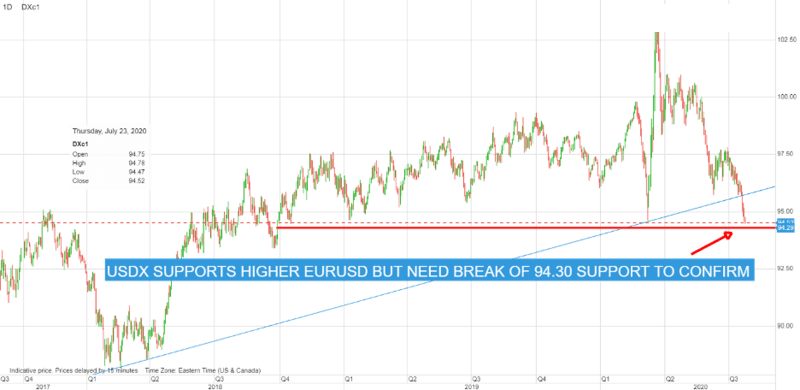 美元指数技术面:7月20日,美元指数跌破2018上升趋势线的95.70点位,美元的下跌趋势得到证实,然而,在跌破94.30的支撑位之前,仍有反弹至97.50的风险。