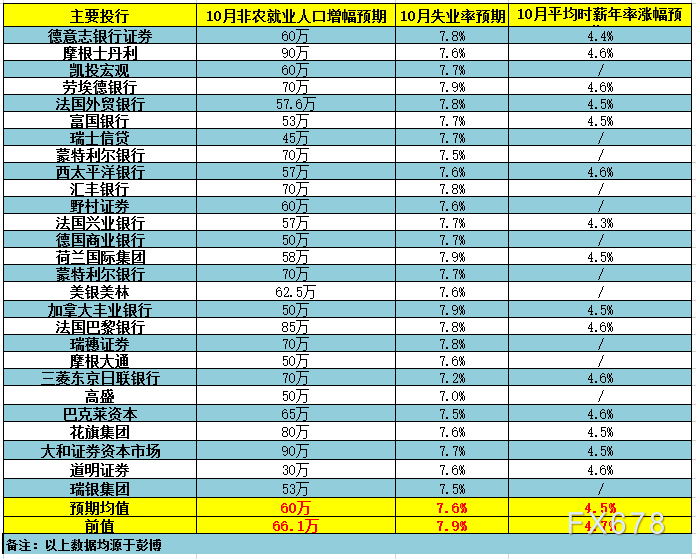 北京时间周五(11月6日)21:30将公布美国10月季调后非农就业人口变动和失业率,周三(11月4日)包括摩根士丹利(Morgan Stanley)在内的27家大型投行发表了对此次数据的前瞻,具体如下。