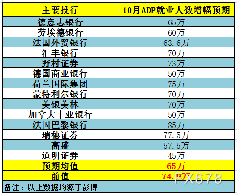 北京时间周三21:15将公布美国10月ADP就业人数,该数据素有“小非农”之称,包括德意志银行在内的14家大型投行发表了10月ADP就业人数增幅的前瞻,具体如下: