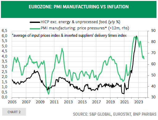不过,2023年应该是欧元区反通货膨胀的一年,因为基数效应有利,需求增长放缓,供应瓶颈缓解。 在供应方面,基于调查的价格压力——投入价格和交付时间评估的平均值——正在下降,考虑到与核心通胀的历史关系,这是一个令人希望的进展(图2)。 欧洲央行、IMF和私营部门经济学家的最新预测都预计,到明年年底通胀将下降。 因此,真正的问题似乎不在于通胀的方向——它应该是下行的——而是在于通胀下行的速度和程度。 换句话说:是否存在这样一种风险,即通胀预测继续像近两年那样过于乐观,可能需要进一步向上调整? 这个问题的答案对利率和增长前景都很重要。 如果下降速度低于预期,可能会让欧洲央行相信有必要采取比目前市场定价更高的加息幅度,这意味着降低通胀需要付出更大的产出成本。
